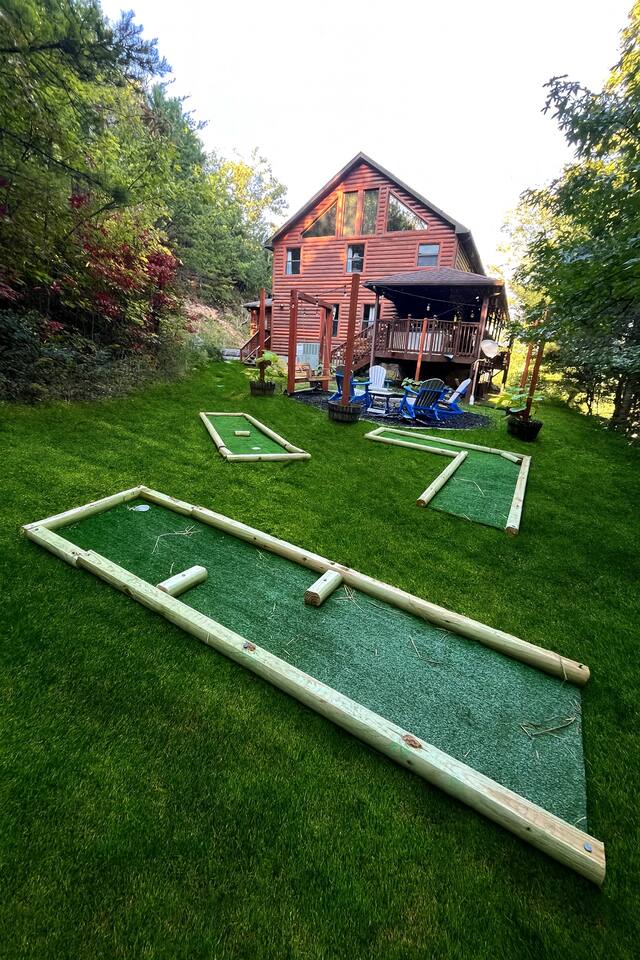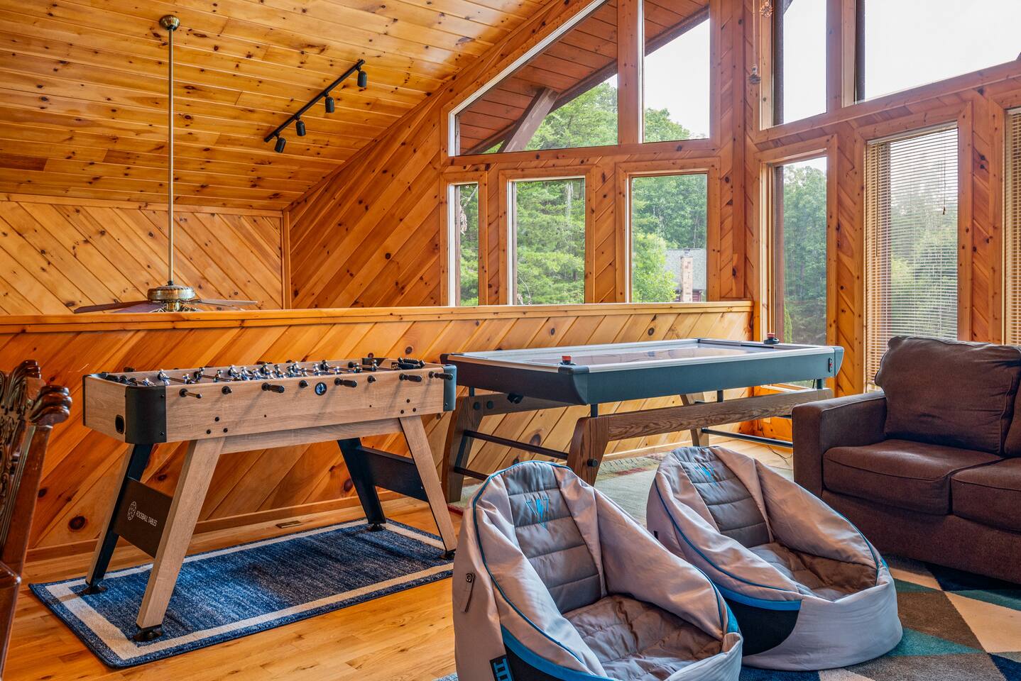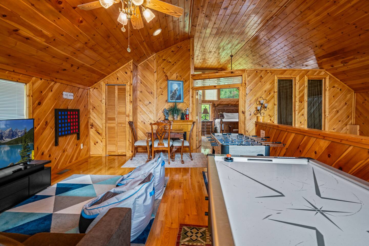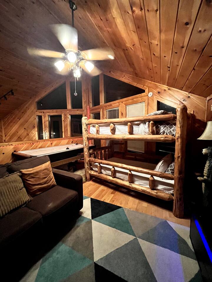 A-Frame secluded cabin w/ views in Shagbark resort. Three bedrooms w/loft, ensuite bathrooms, generous parking & jetted bathtub. •Covered hot tub w/outdoor seating & dining •TWO game rooms-pool table, arcades, Hydro Thunder, air hockey, foosball, poker, & streaming TV’s •Resort amenities include swimming pool (open memorial day to labor day), tennis/pickleball courts, playground, & frisbee golf •Wraparound deck w/new fire pit, swing, cornhole & private backyard!