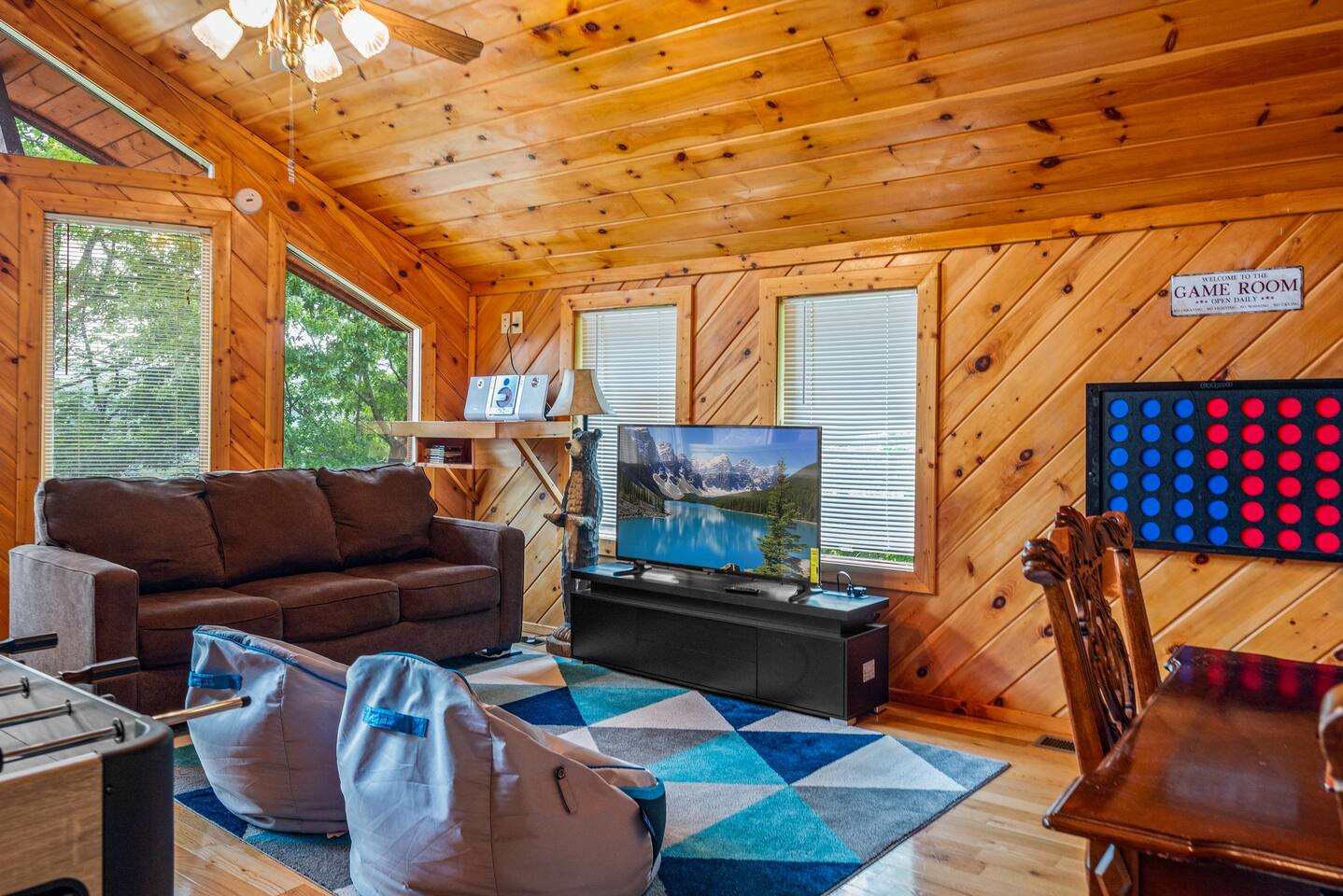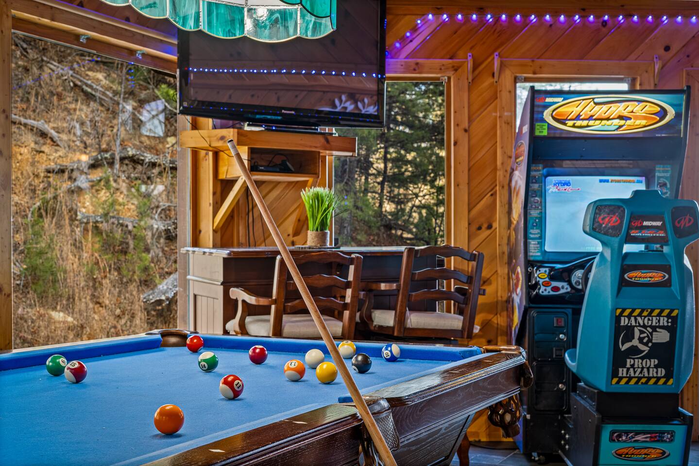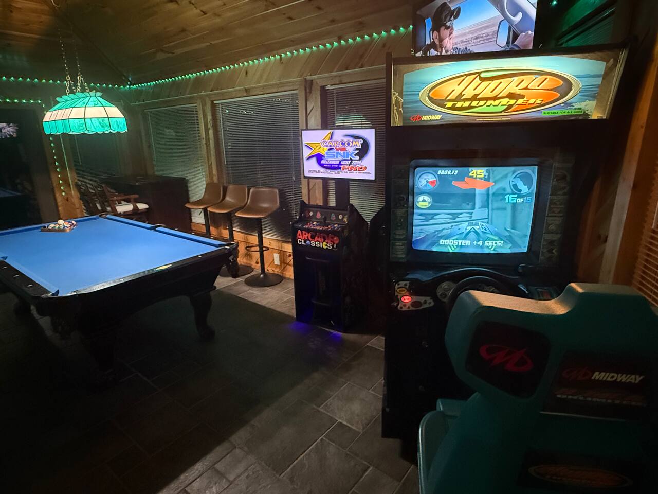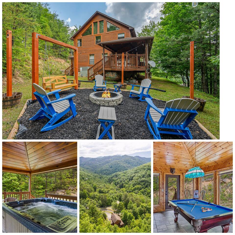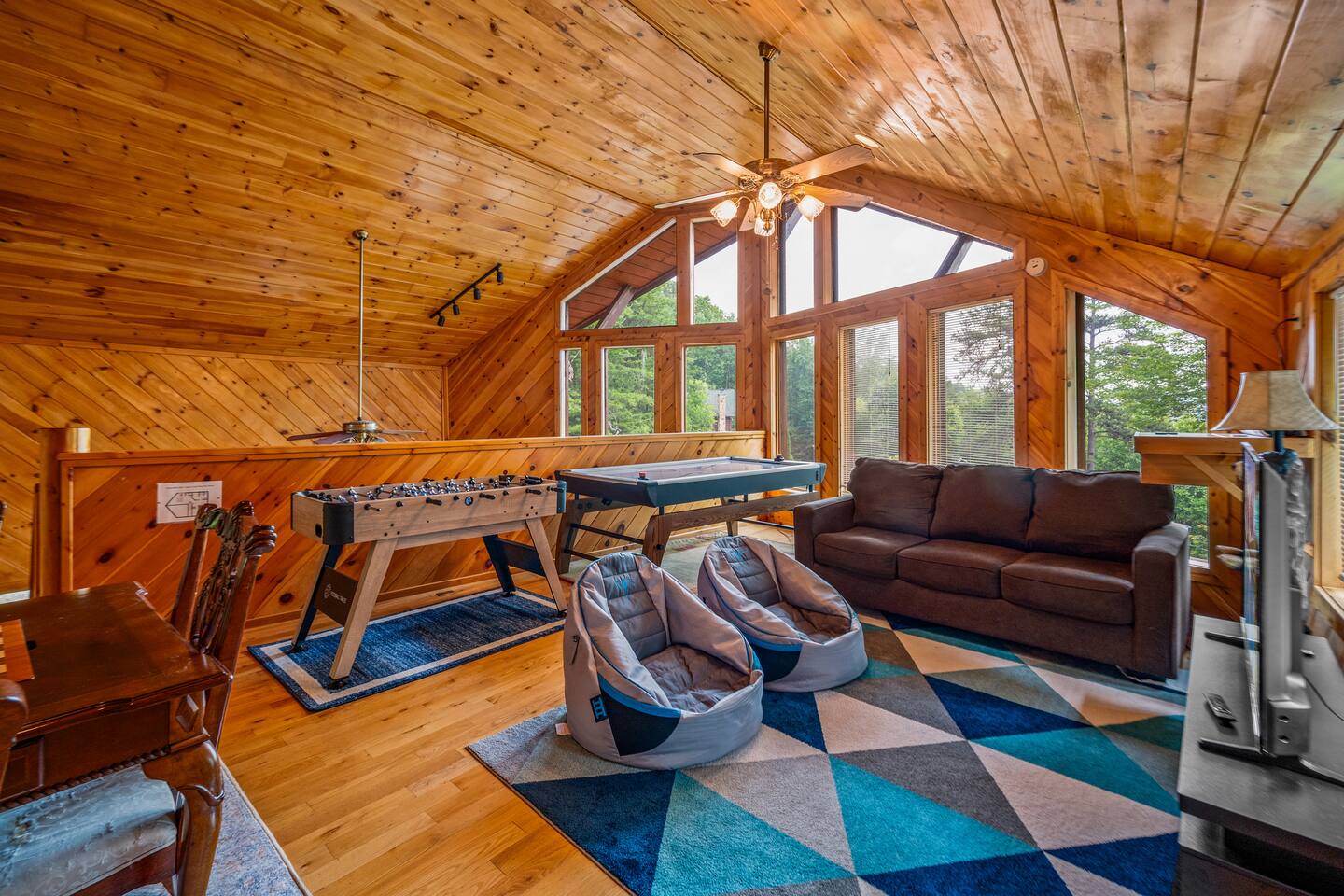 Welcome to Mountain Music Perched at the top of the gated Shagbark Resort, Mountain Music combines modern comfort, breathtaking views, and timeless Smoky Mountain charm. This four bedroom, three bathroom A-frame cabin is the perfect retreat for families, couples, or friends seeking relaxation, adventure, and unforgettable memories. *Spacious Comfort and Modern Amenities* - Three Bedrooms with En-Suite Bathrooms: Each bedroom offers privacy, comfort, and thoughtful touches for a restful stay. -Loft with bunk beds, streaming TV, air hockey, foosball, three arcades, giant connect 4, sleeper sofa, and electric fireplace for the kids to play - Open Floor Plan: The spacious living area seamlessly connects to the fully equipped kitchen and dining space, making it perfect for gatherings. - Game Room: Billiards table, multicade, Hydro Thunder sit down racing arcade, and streaming TV. - Private Hot Tub: Relax under the gazebo in the outdoor hot tub while soaking in the serene mountain views. Outdoor seating too! -Deck views: Outdoor dining with views, gas grill, and propane fire pit on the wraparound deck. -Backyard: With large fire pit, swing seat, and mini golf for fun! - Convenience at Your Fingertips: High-speed Wi-Fi, a washer and dryer, and ample parking ensure your stay is stress-free. -full fire pit Please note that the fireplace is currently undergoing maintenance and unavailable for use. *Experience Smoky Mountain Serenity* - Breathtaking Views: Marvel at panoramic mountain vistas from the wrap-around porch and loft area, perfect for morning coffee or evening relaxation. - Cozy Living Spaces: The living room, featuring luxurious furnishings invites you to unwind in style. - Resort Perks: Guests enjoy access to free Shagbark Resort amenities, including a swimming pool, tennis, pickleball, basketball courts, a playground, frisbee golf, and cornhole. *Explore the Heart of the Smokies* Nestled just 10 minutes from downtown Pigeon Forge, Mountain Music is your gateway to the area's top attractions: - Dollywood: Experience thrilling rides, shows, and family fun at this world-class theme park. - The Island in Pigeon Forge: Enjoy dining, shopping, and entertainment in a vibrant setting. - Great Smoky Mountains National Park: Discover hiking trails, scenic drives, and breathtaking natural beauty. - Downtown Gatlinburg: Explore charming shops, local eateries, and attractions like Ripley’s Aquarium and Anakeesta, just a short drive away. Why Choose Mountain Music? Whether you’re relaxing in the private hot tub, enjoying a game night in the loft, or exploring the nearby Smoky Mountain attractions, Mountain Music offers the perfect blend of luxury, adventure, and tranquility. Book your stay today and let this unforgettable cabin become the soundtrack to your Smoky Mountain getaway!